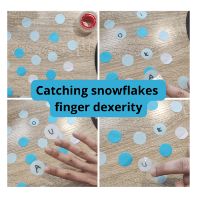 Ahora, las posibilidades de juego aquí son infinitas. Podemos pedirles que coja dos copos a la vez con combinaciones distintas de dedos, o escribir letras en los copos (como yo las vocales) y que busquen el correcto, o hacer carreras a ver quién captura un copito con x dedo primero…