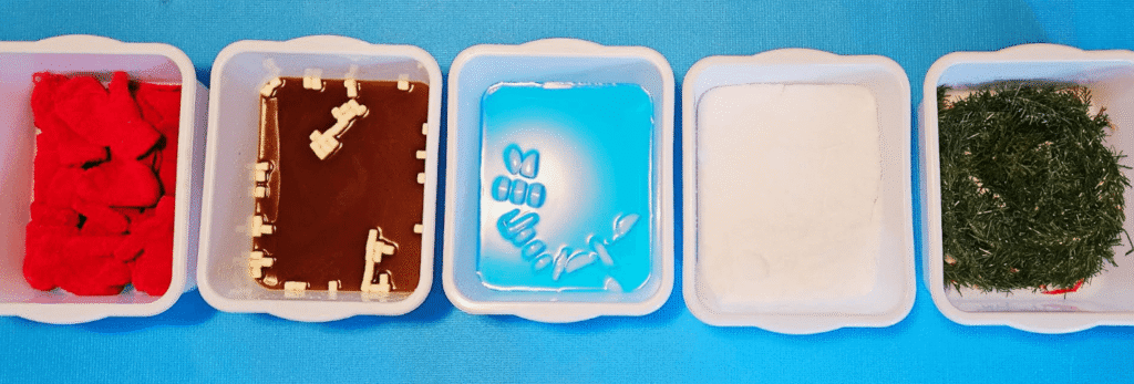 - Gelatina. Haz gelatina o cómprala, y déjala en la nevera antes de realizar esta actividad. Después la puedes desmenuzar en el barreño.